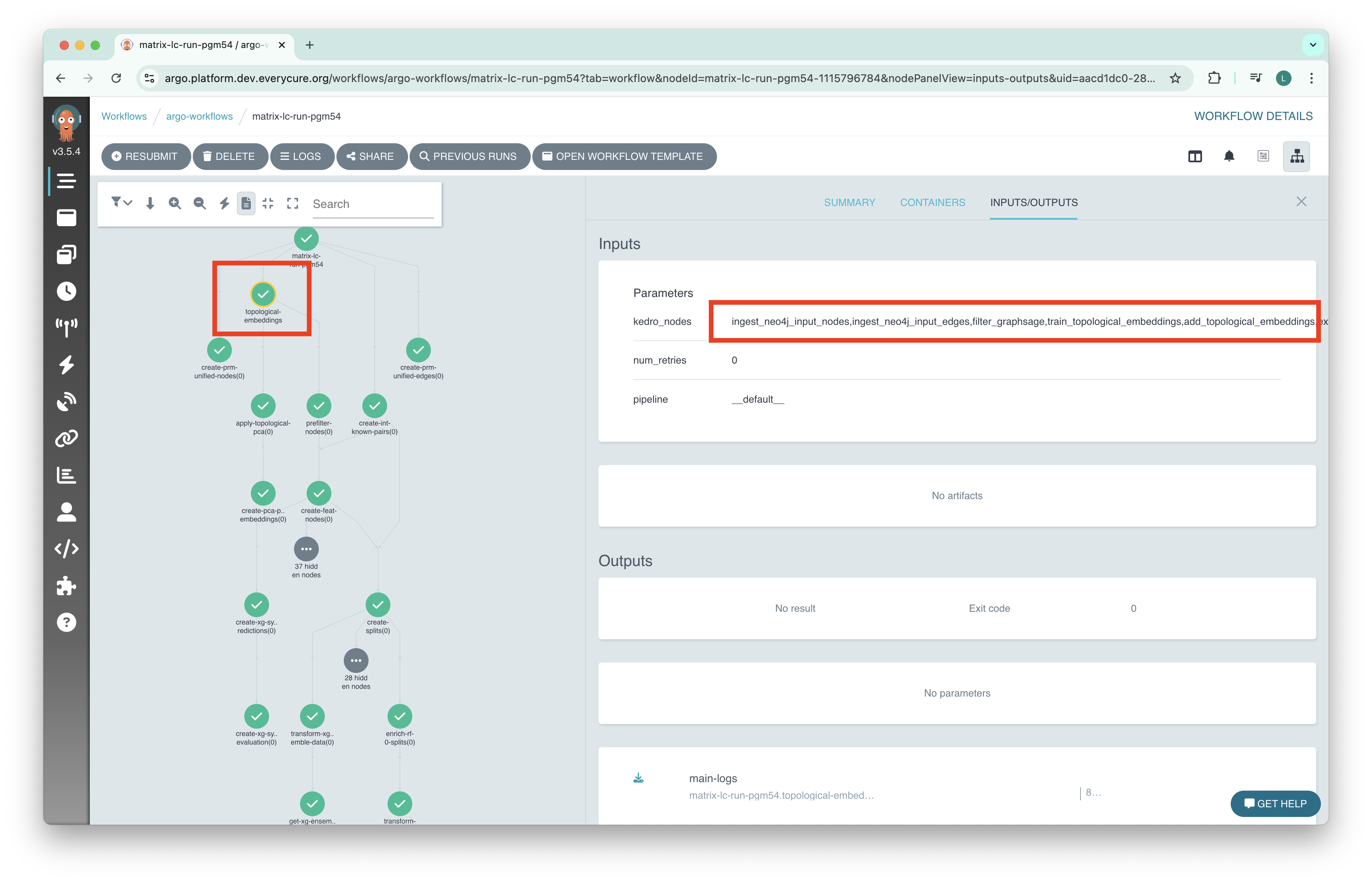 The view below shows the fusing result, there is a single step in the Workflow for topological embeddings. This step executes multiple Kedro nodes on a Neo4J enabled machine.