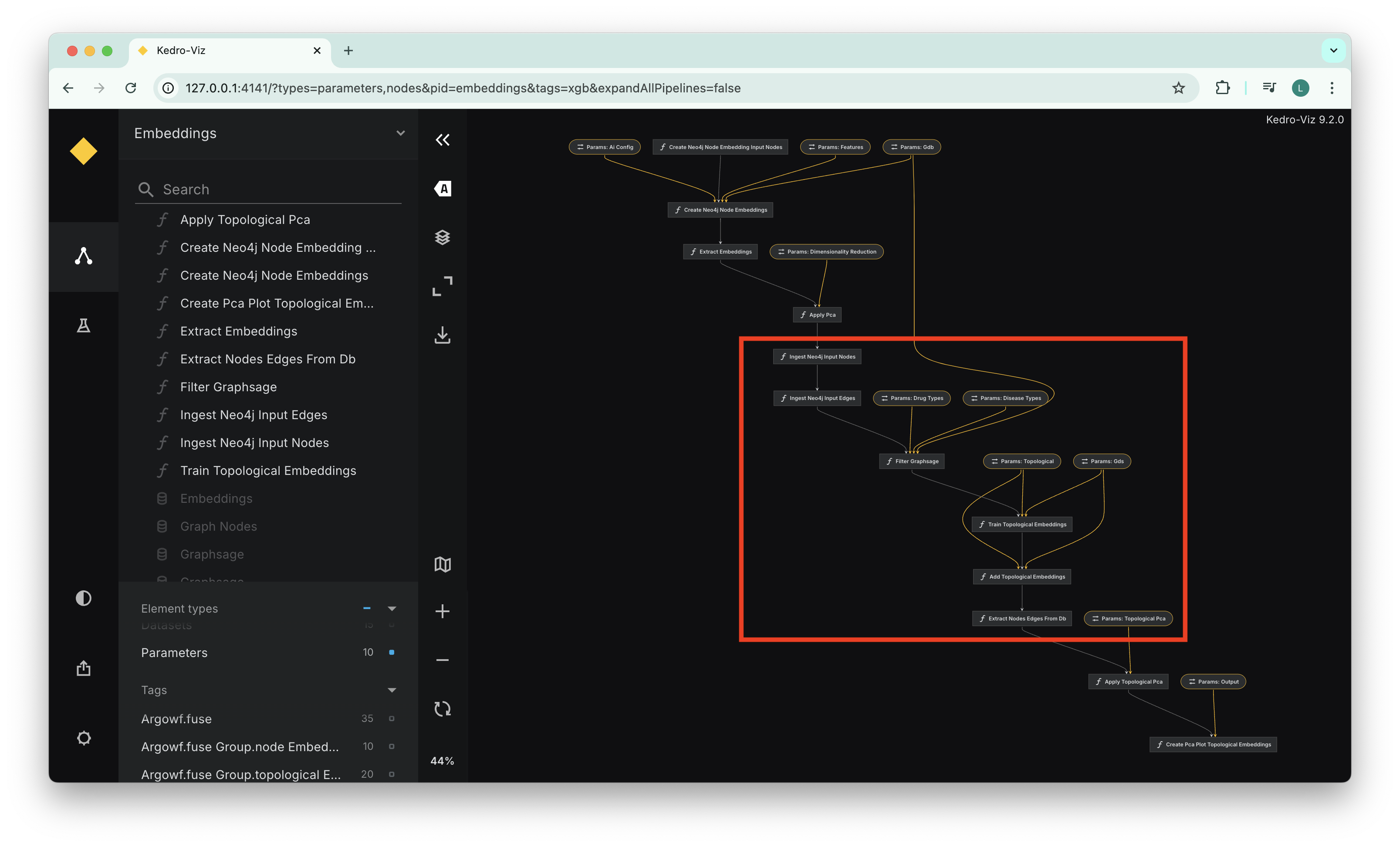 The view below shows our Kedro viz graph, each step of the topological embedding computation stage is represented as a distinct Kedro node, the highlighted selection shows fusing intent.