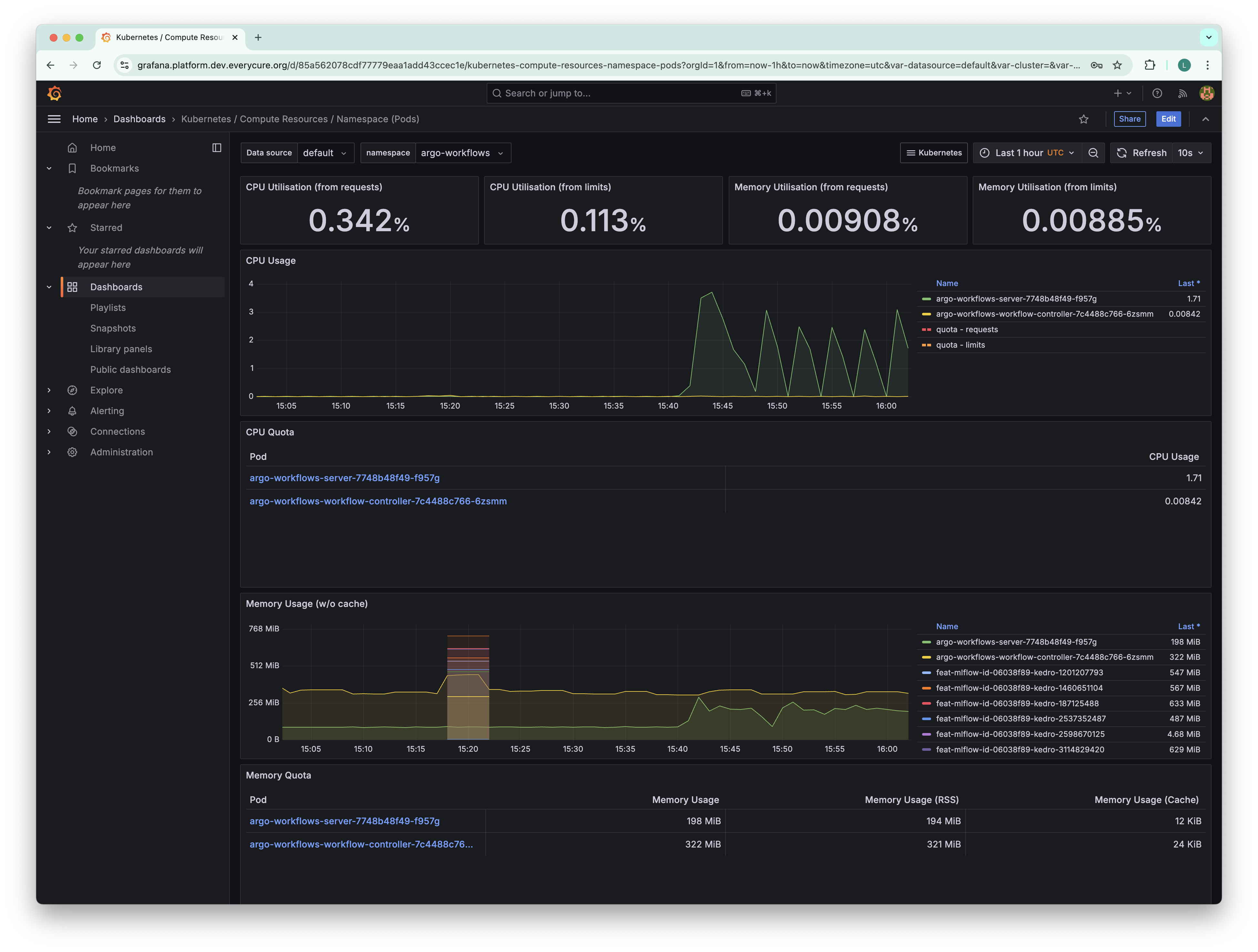 Workloads running on Kubernetes might fail due to them hitting resource limits. GCP provides some observability insights, but remains quite limited. We've therefore installed Grafana and Prometheus on the cluster.