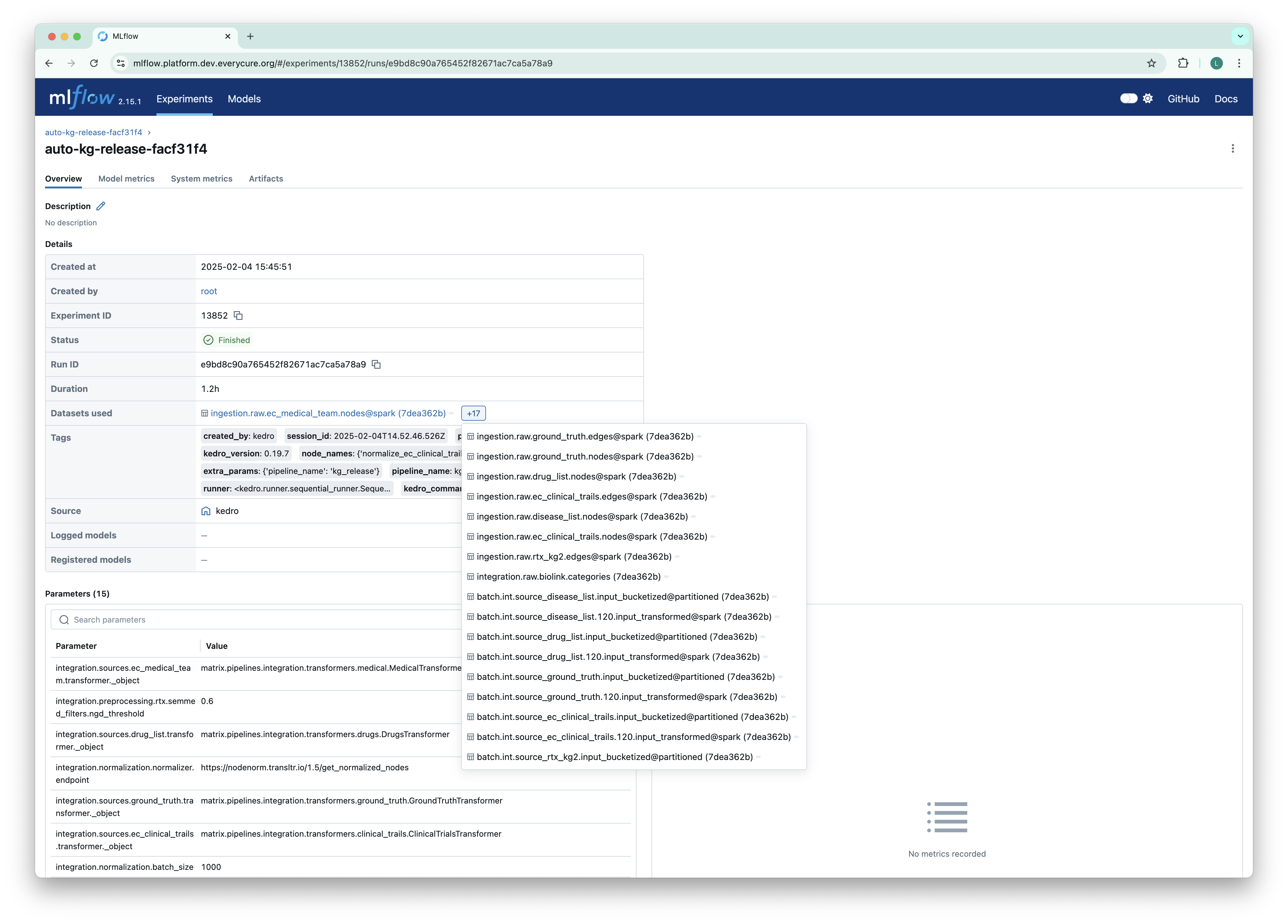 MLflow now logs the datasets used within the pipeline. This significantly improves the traceability of experiments by recording the exact data versions used for each run. This feature enhances reproducibility and provides valuable context for analyzing experiment results. (PR #1048)